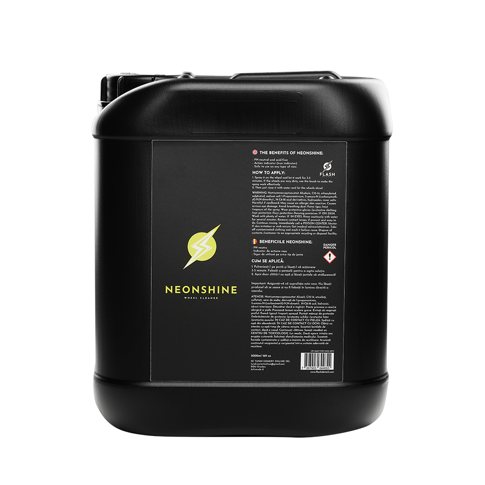 NEONSHINE este un spray puternic, fără acid, care îndepărtează în siguranță și eficient praful de frână, rugina și resturile de cauciuc de pe toate tipurile de jante. Formula sa de gel de ultimă generație face vizibil progresul curățării cu o schimbare strălucitoare de la roșu la violet în timpul curățării. NEONSHINE are pH neutru, ceea ce îl face perfect pentru a fi utilizat pe toate tipurile de jante. Agitați sticla și pulverizați-o pe Jantele reci, lăsați soluția timp de 3-5 minute înainte de a clăti cu un jet puternic de apă. Vă recomandăm să folosiți pensula noastră de detailing Flash Brush pentru a obține cele mai bune rezultate.
